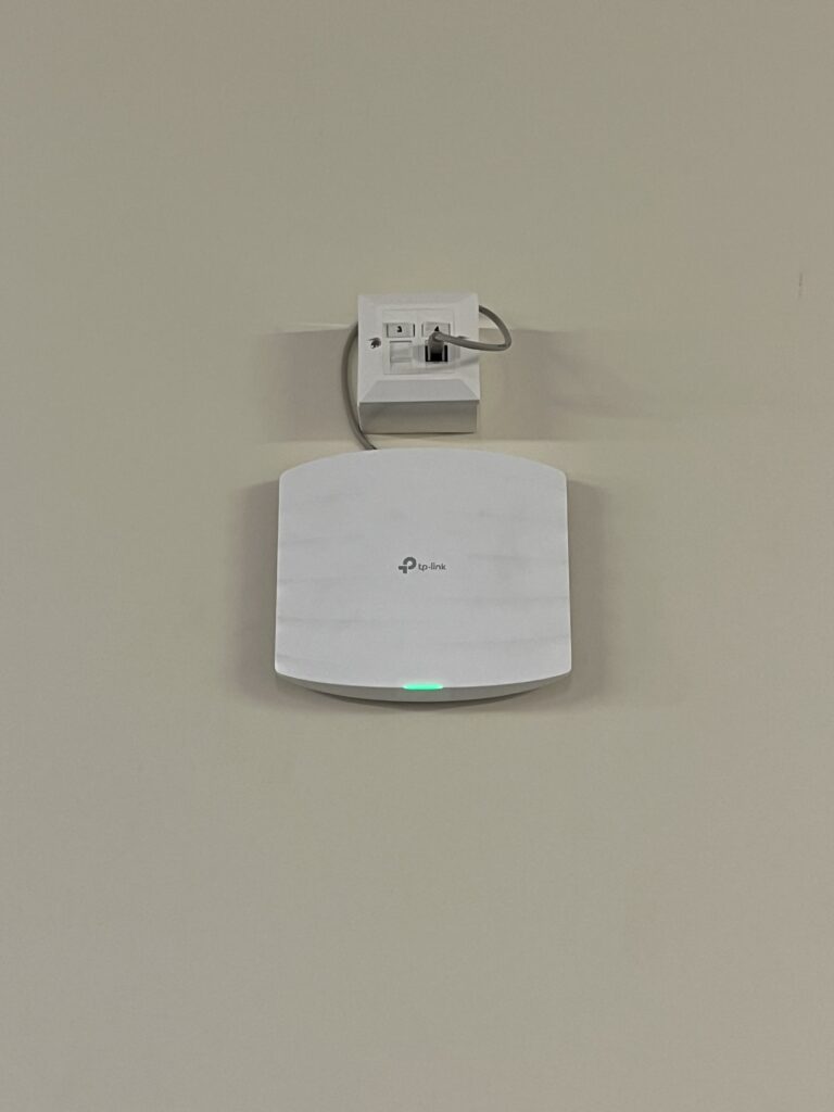 - Omada Switch: A single TP-Link Omada managed switch was installed to provide reliable wired connections to critical devices and administrative areas, such as offices and conference rooms.